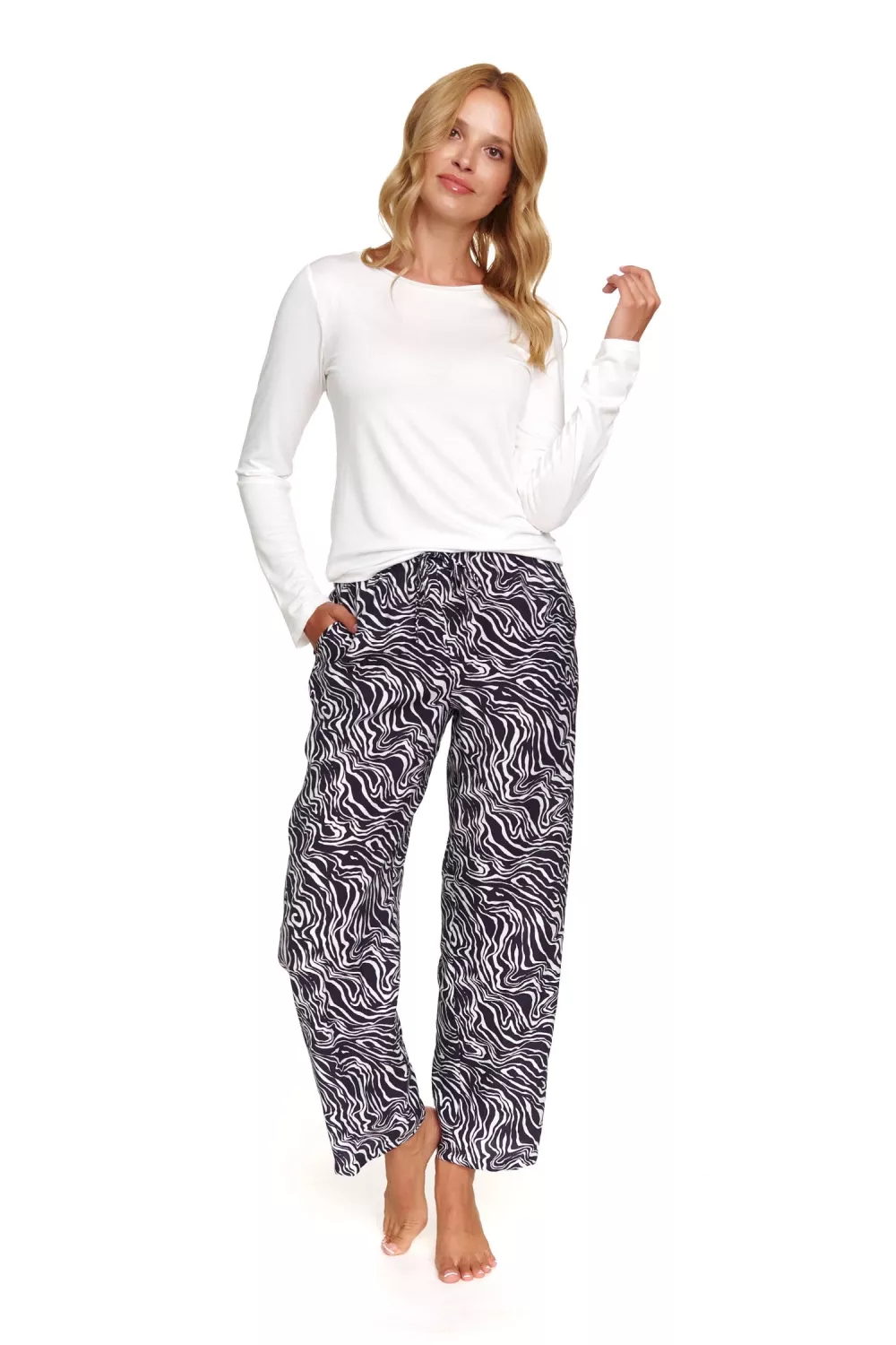 - dlhé vzorované nohavice s vreckami