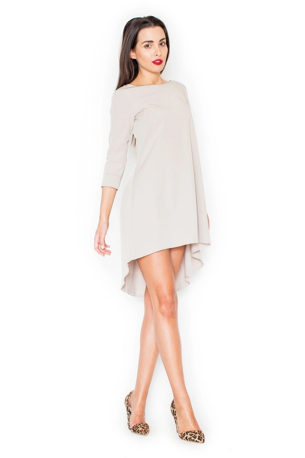 Elegantné šaty K0141 KATRUS s asymetrickým strihom majú rukávy s 3/4 dĺžkou. Sukňa sa rozširuje z prednej časti na zadnú a nariasená. K dispozícii v troch farbách