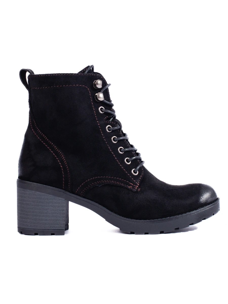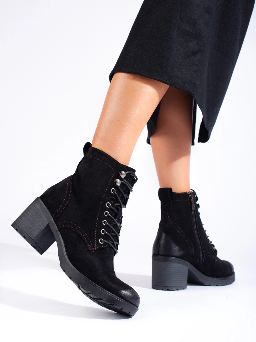 Módne dámske členkové topánky čiernej farby na širokom podpätku